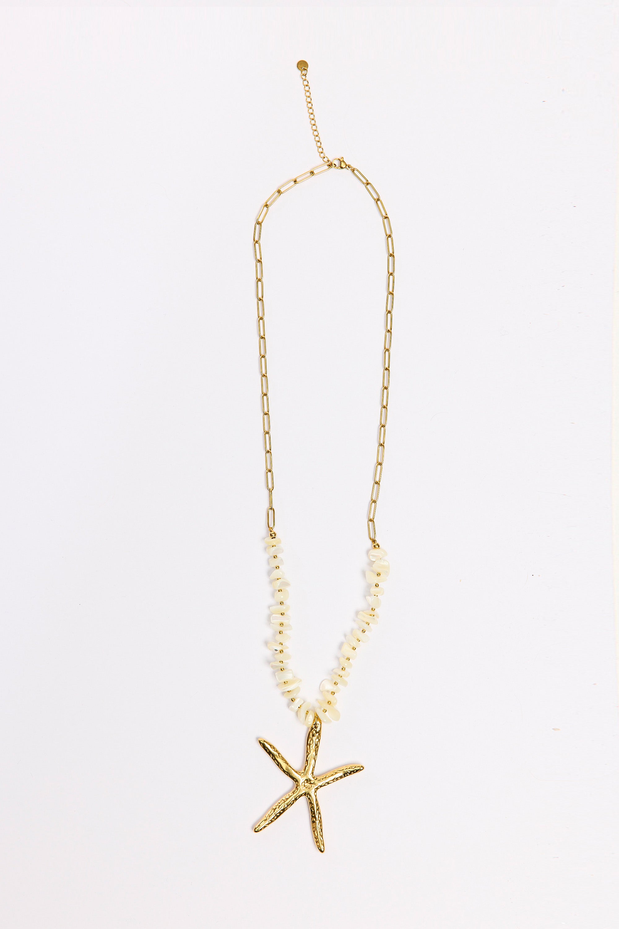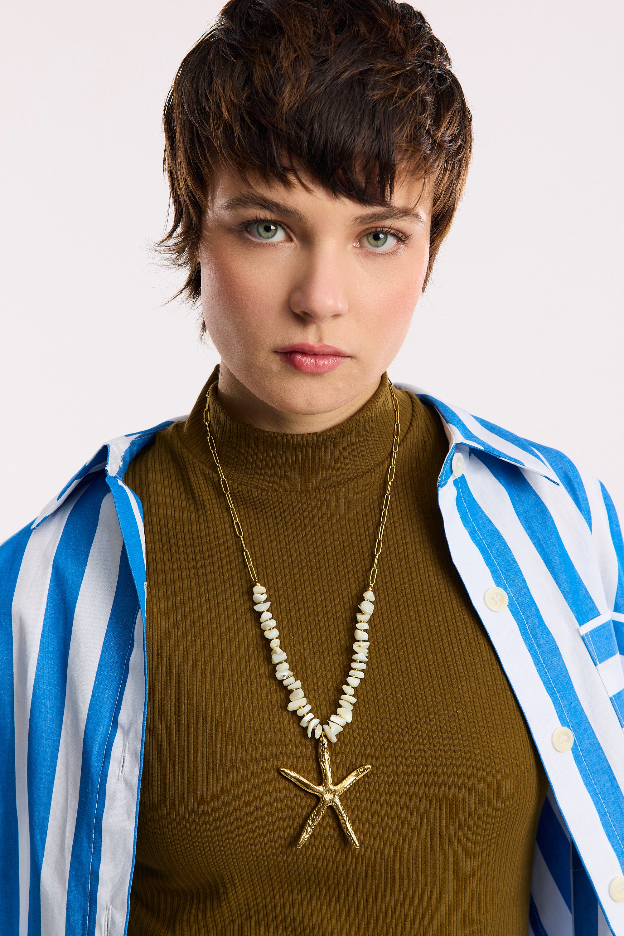 Inspired by the ease of summer days by the water, the Beachcomber Necklace combines relaxed texture with understated polish. A gold starfish pendant sits at the centre, strung alongside irregular shell-like beads and finished with an elongated paperclip chain for a clean, contemporary feel.