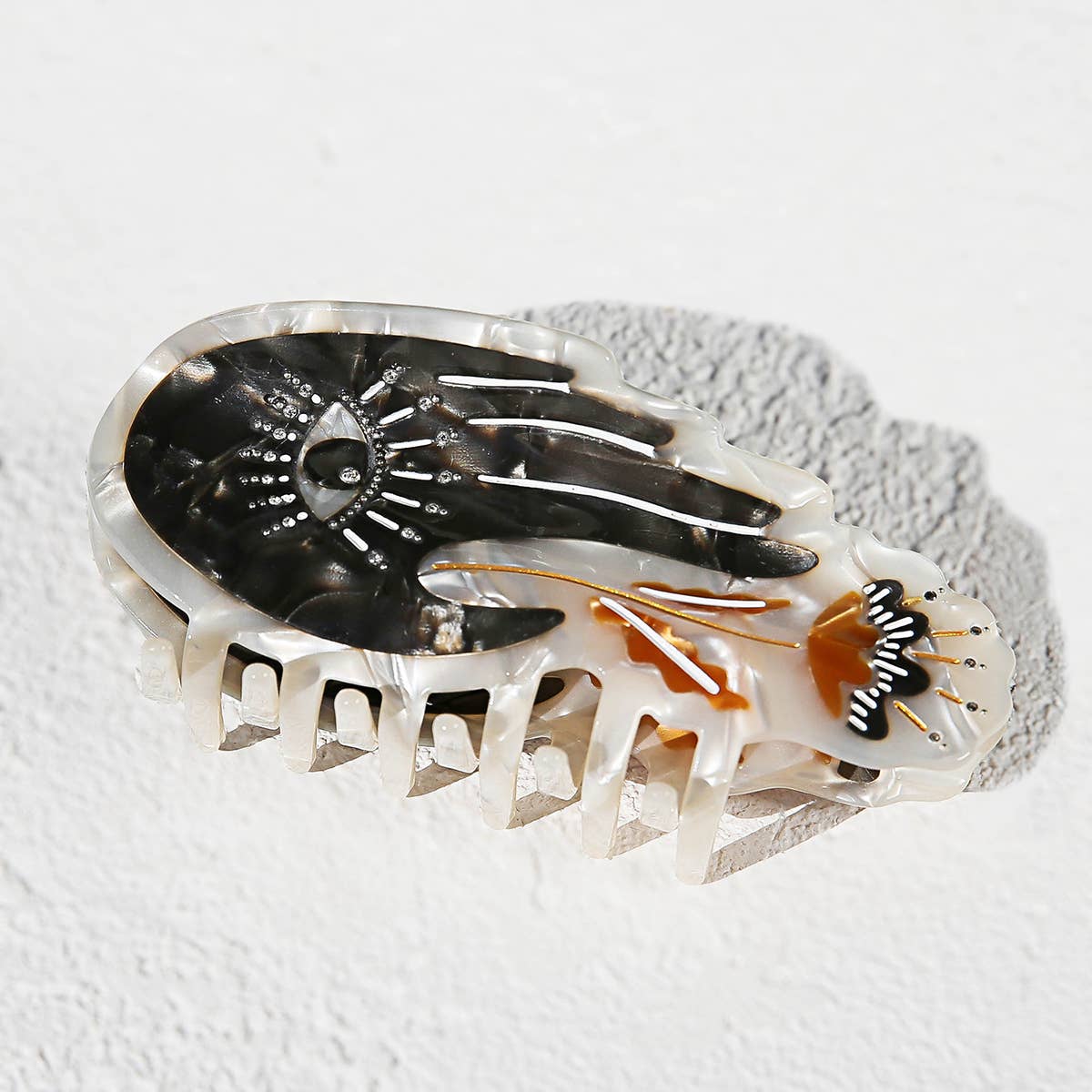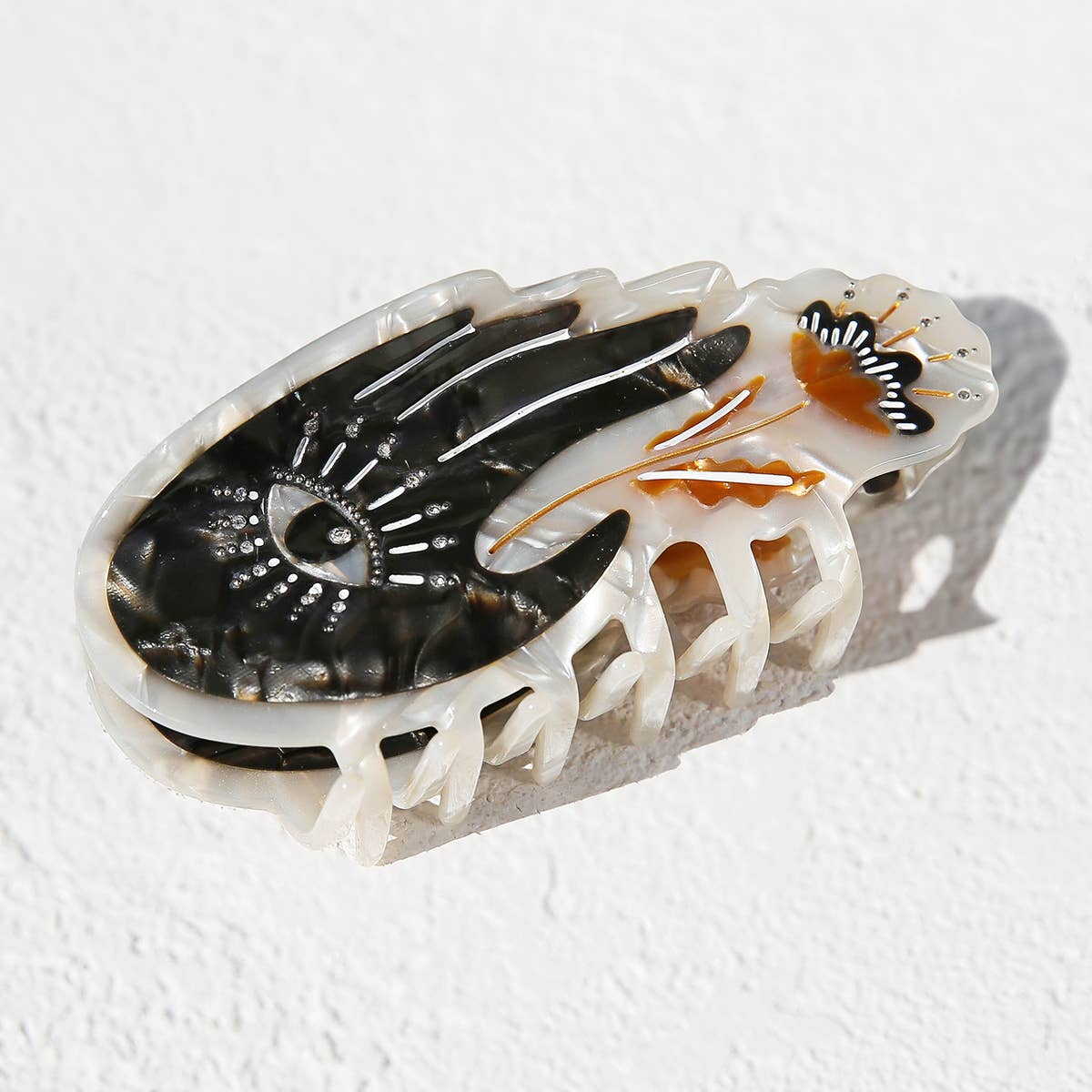 The Palm Hair Claw is thoughtfully designed by Jemima Kingston in her Australian studio, blending playful artistry with functional form. Made using a plant-based biodegradable acetate combined with traditional acetate, paintwork, pearls, and metal components, every design brings together sustainable materials and a distinctive creative touch.
