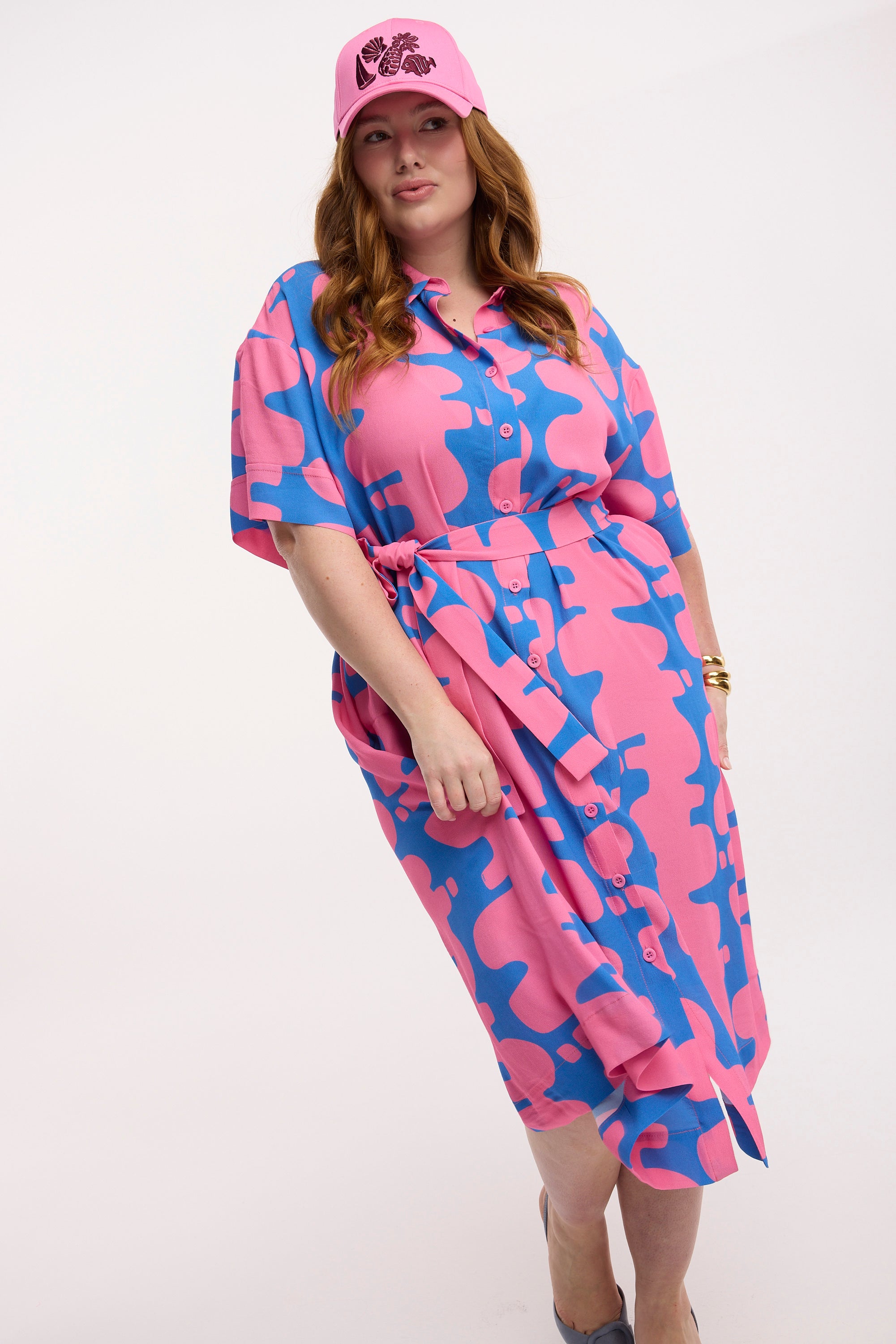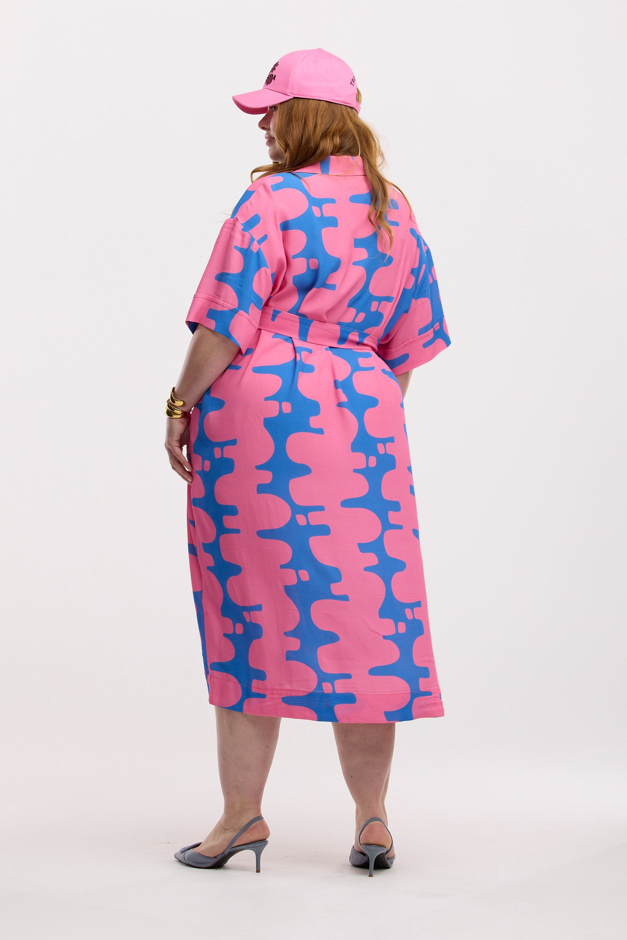 The silhouette is relaxed yet refined: a painterly canvas of colour framed by a modern collar, pin-tucked sleeve cuffs, and a belt that invites you to play with shape. Corozo buttons trace a line down the front, while hidden pockets lend a hand to practicality.