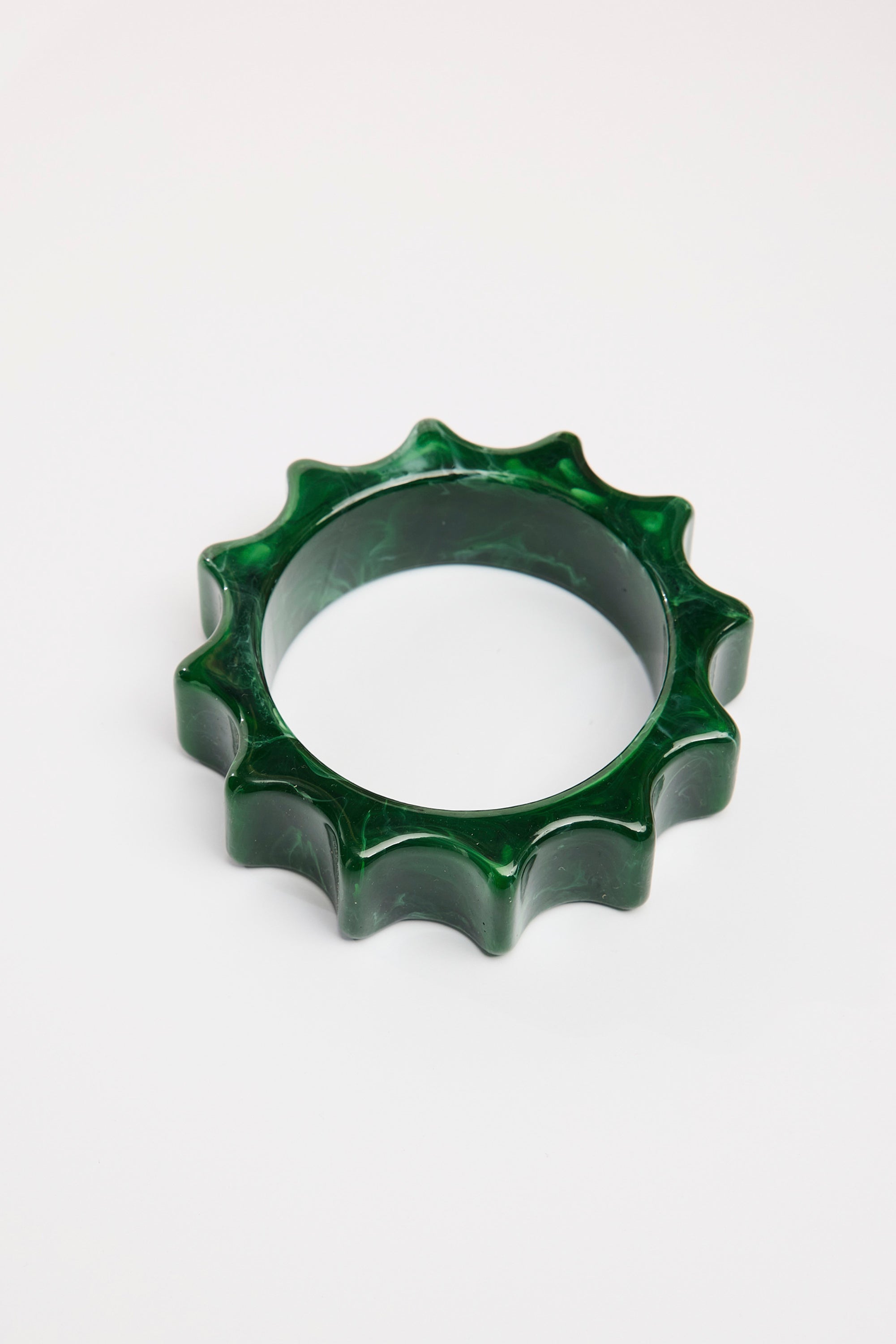 Inspired by the lush canopy of tropical rainforests, the Laneway Bangle in Daintree brings sculptural form and deep, natural beauty to your look. Its unique spiked silhouette and rich, marbled green resin finish catch the light from every angle — a statement of organic elegance and modern design.