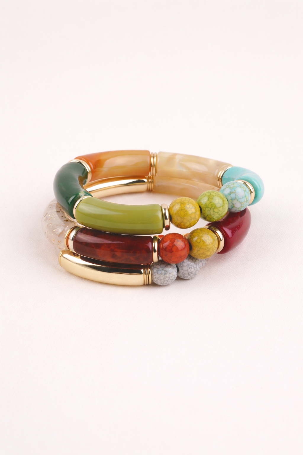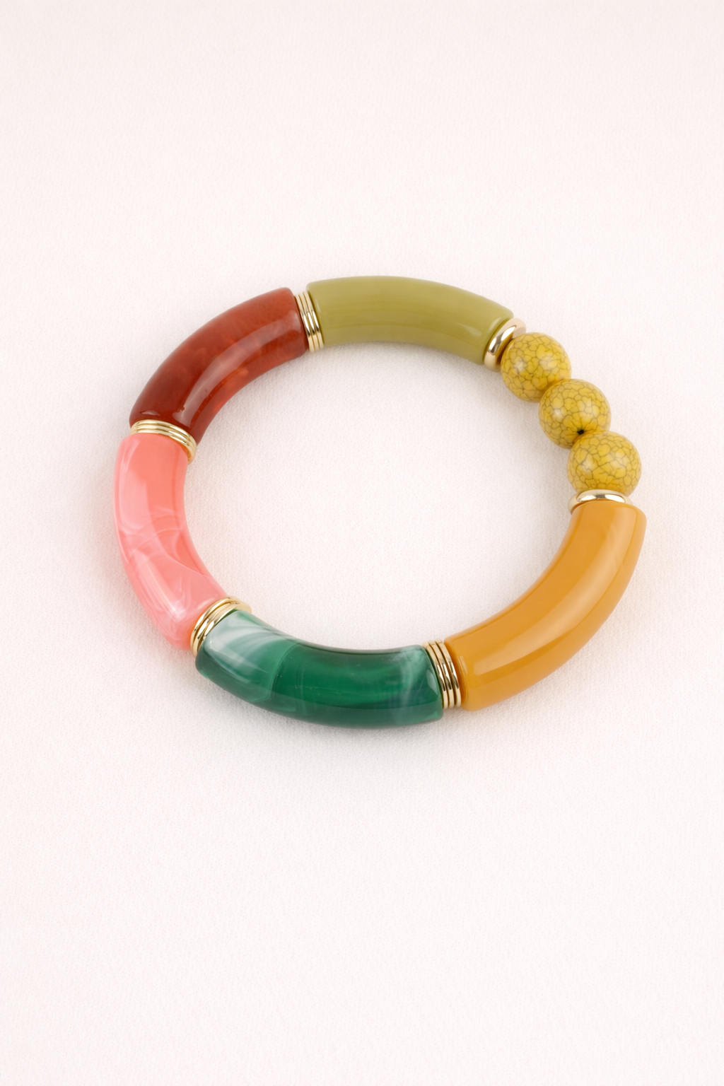 Add a playful pop of colour to your OBUS outfitting with the Magda Bracelet. Designed to slip effortlessly onto the wrist, this elastic bracelet features smooth resin beads paired with polished gold accents for a perfectly balanced mix of fun and refinement.