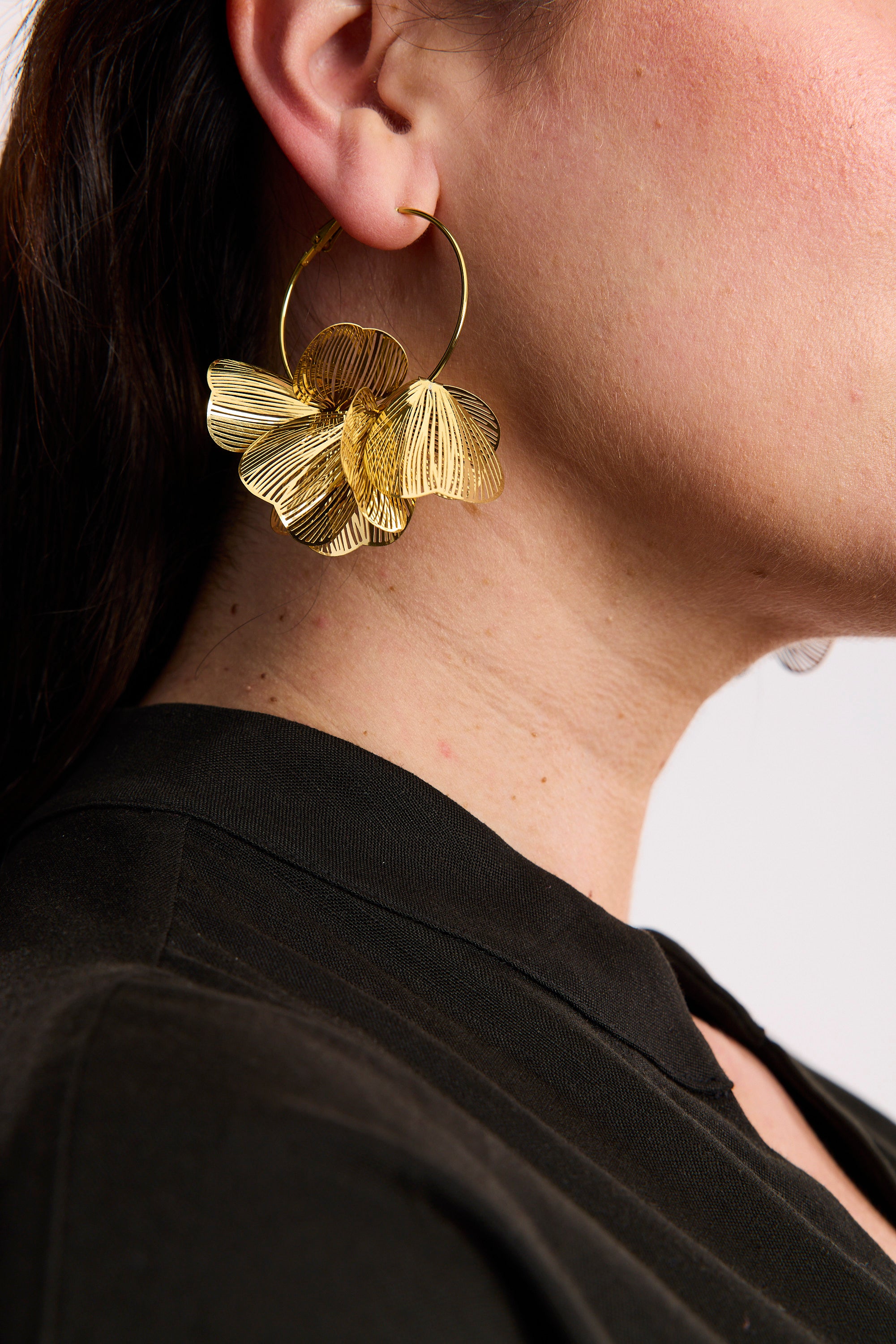 Dramatic and artfully detailed, the SPLENDOUR HOOP EARRING is a true statement in sculptural style. Crafted from ultra-lightweight metal, this floral form catches the light—and attention—with every movement.