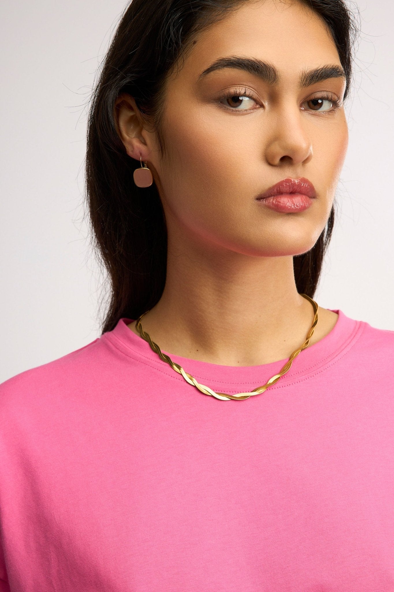 Simple, fluid, and endlessly wearable, the Sunsong Necklace is all about quiet shine. Its braided snake chain catches just enough light to feel special, yet stays subtle enough for everyday.