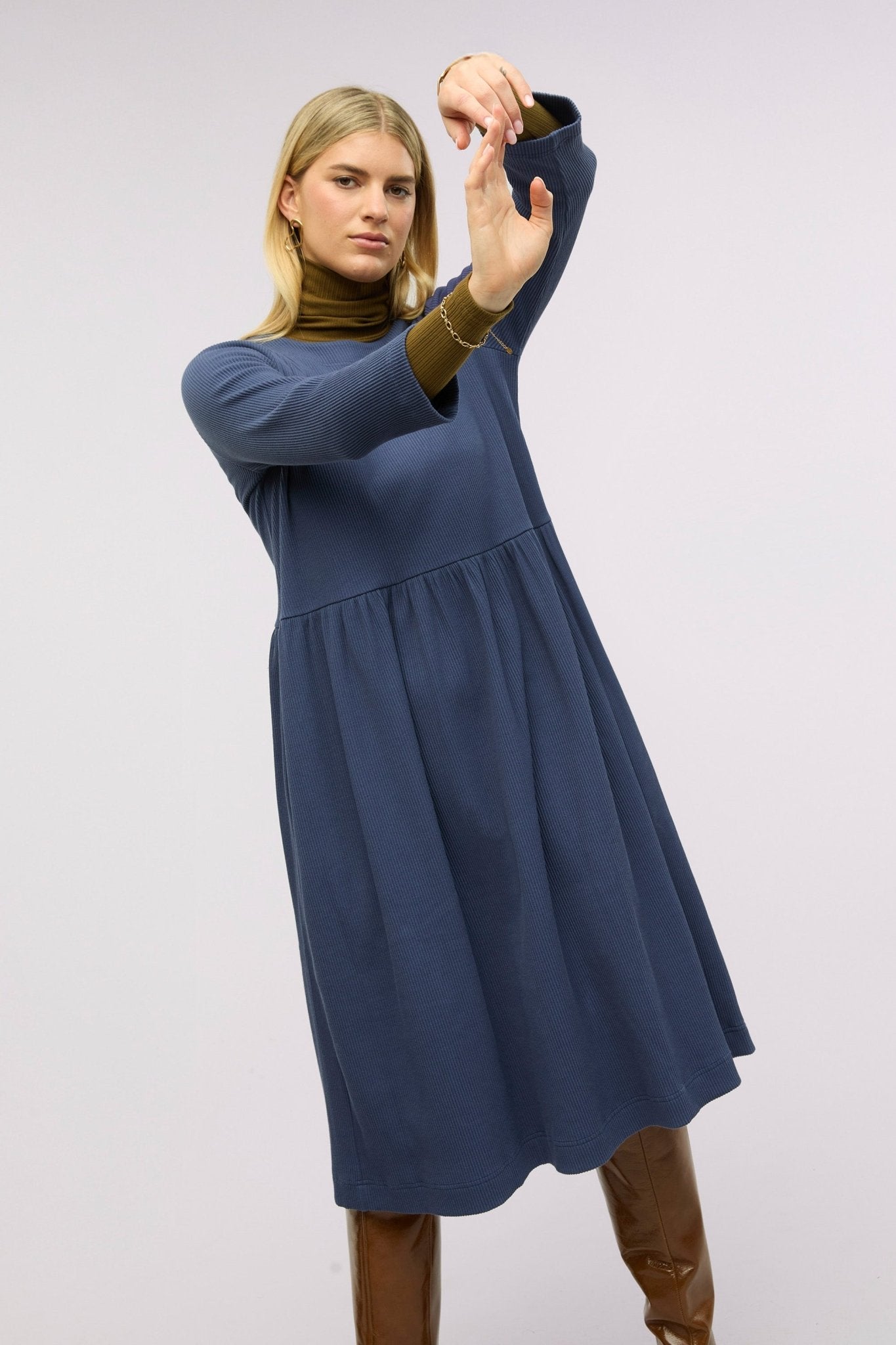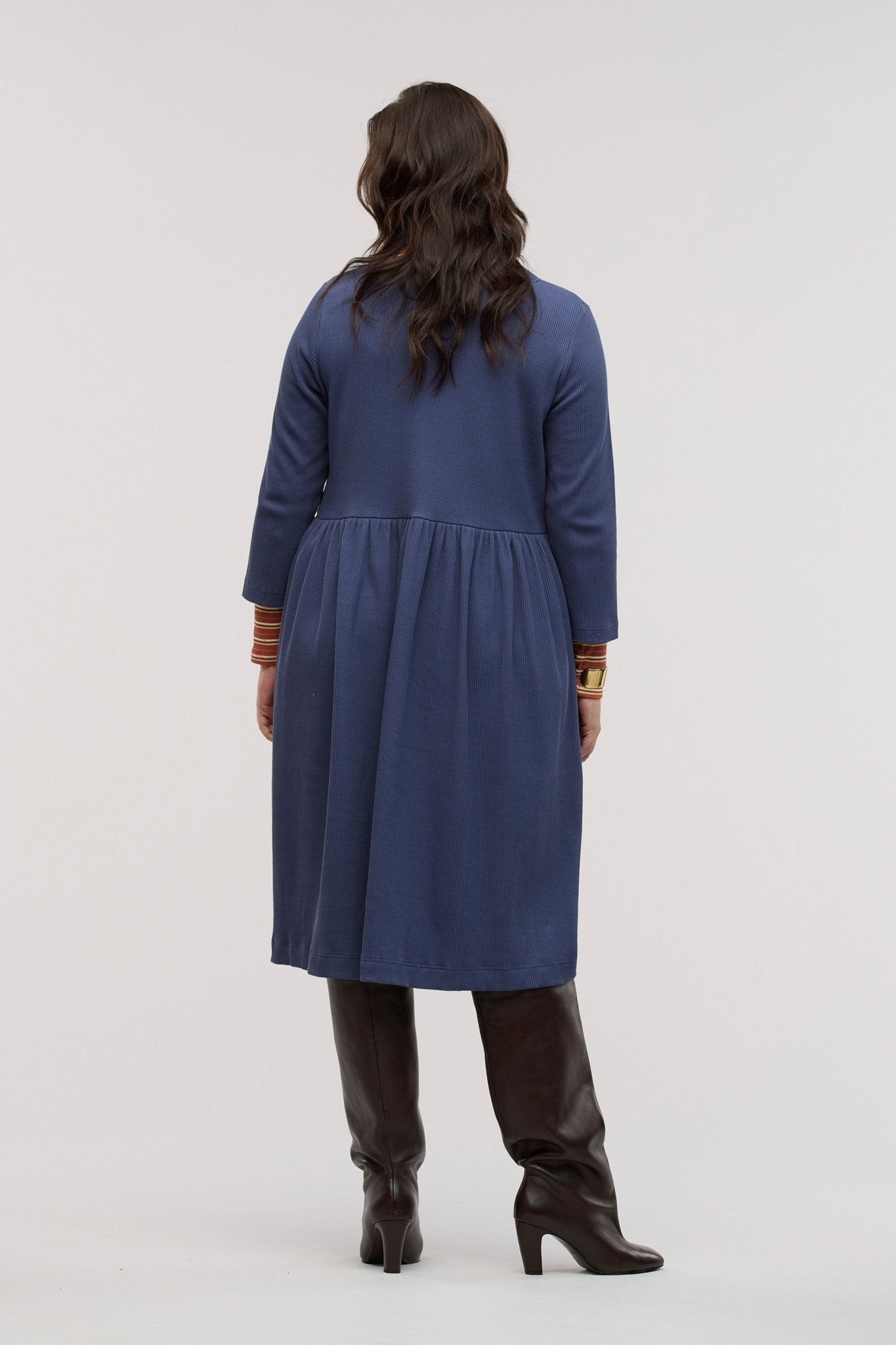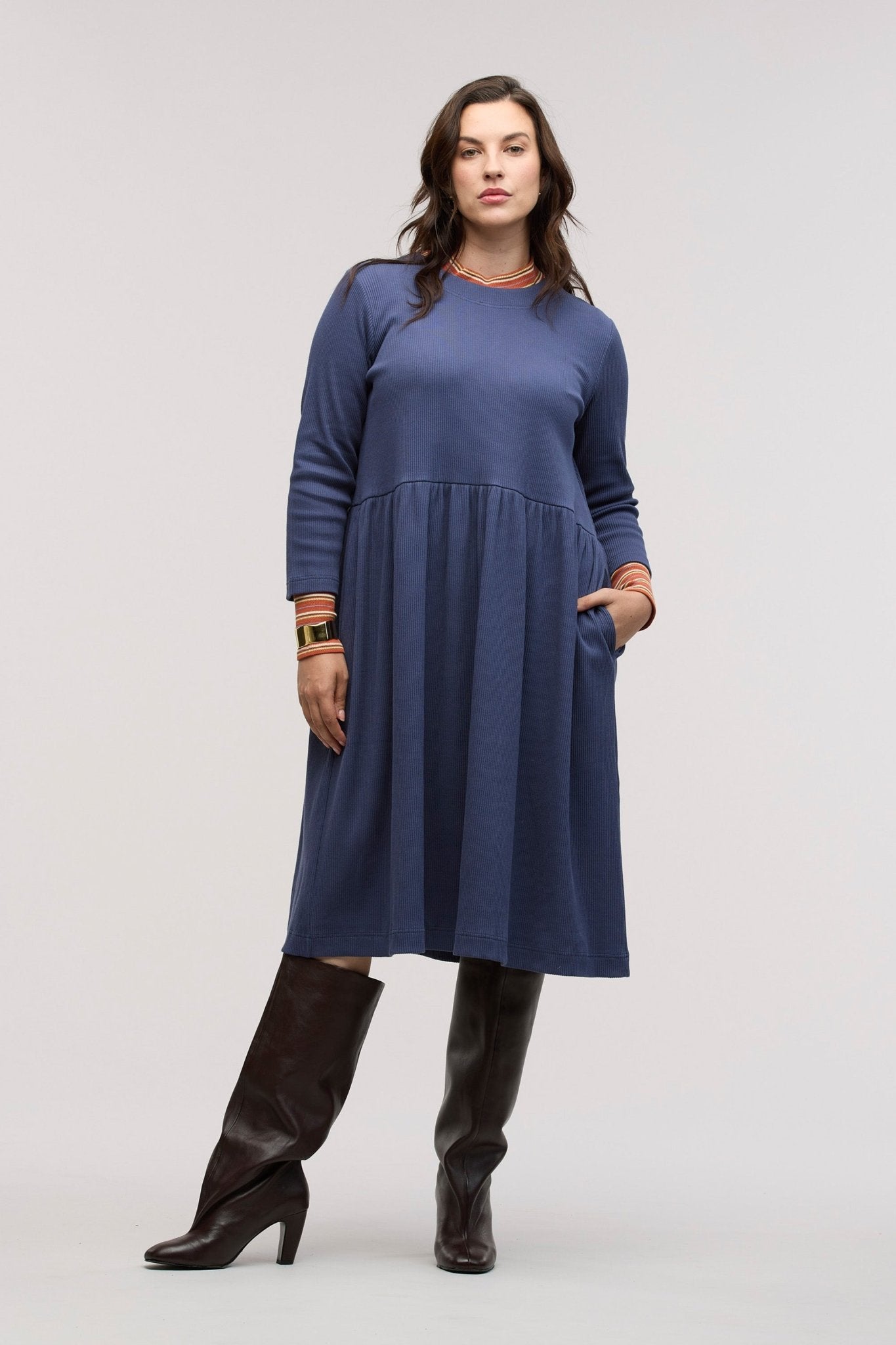 Polished. Practical. Made to move. The TRAVELLER LUXE RIB DRESS is a refined wardrobe staple designed with the rhythm of your workday in mind. A considered evolution of the sell-out Sense & Sentiment Dress, available in two rich, versatile shades: Twilight and Gingernut.