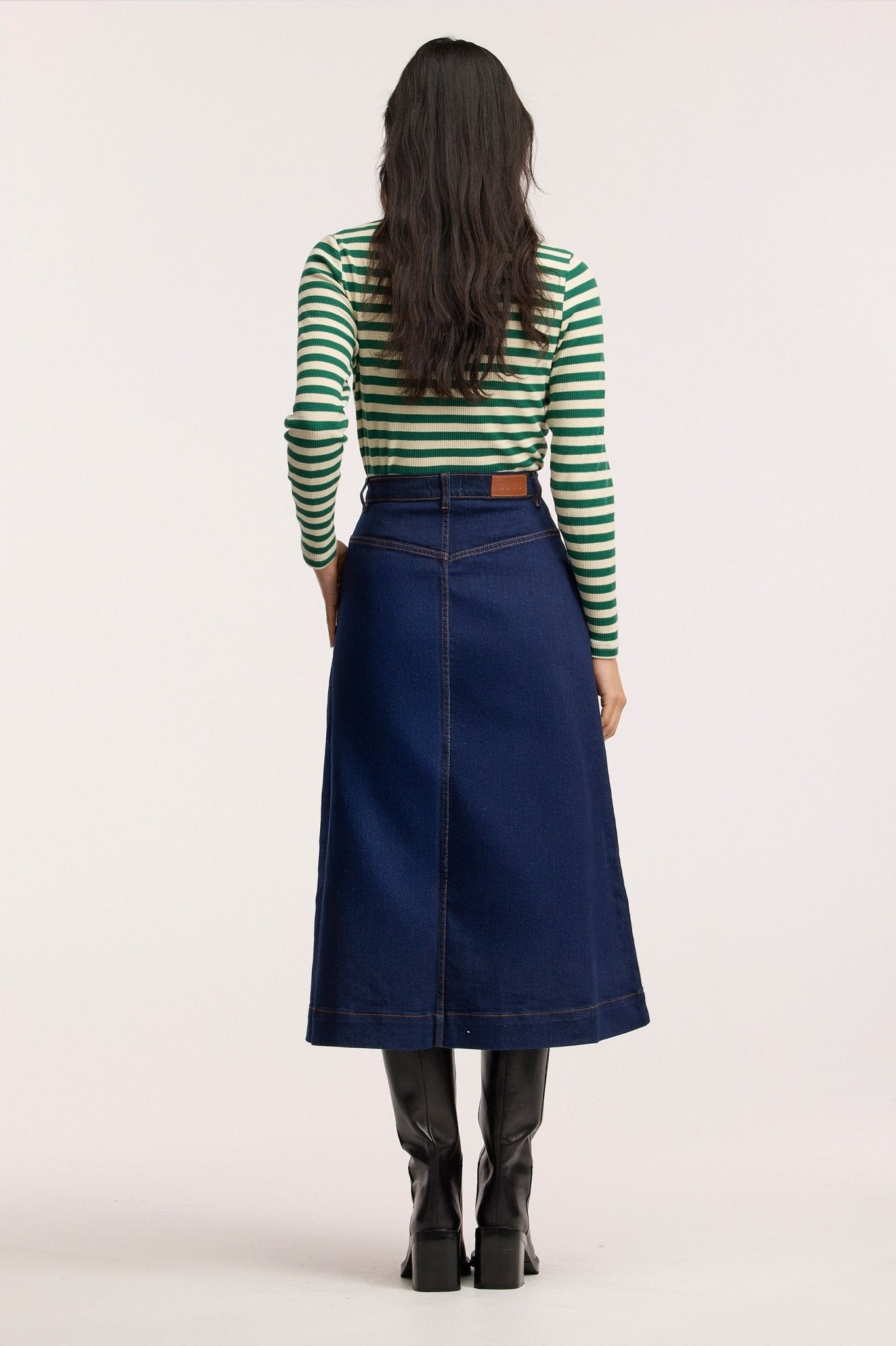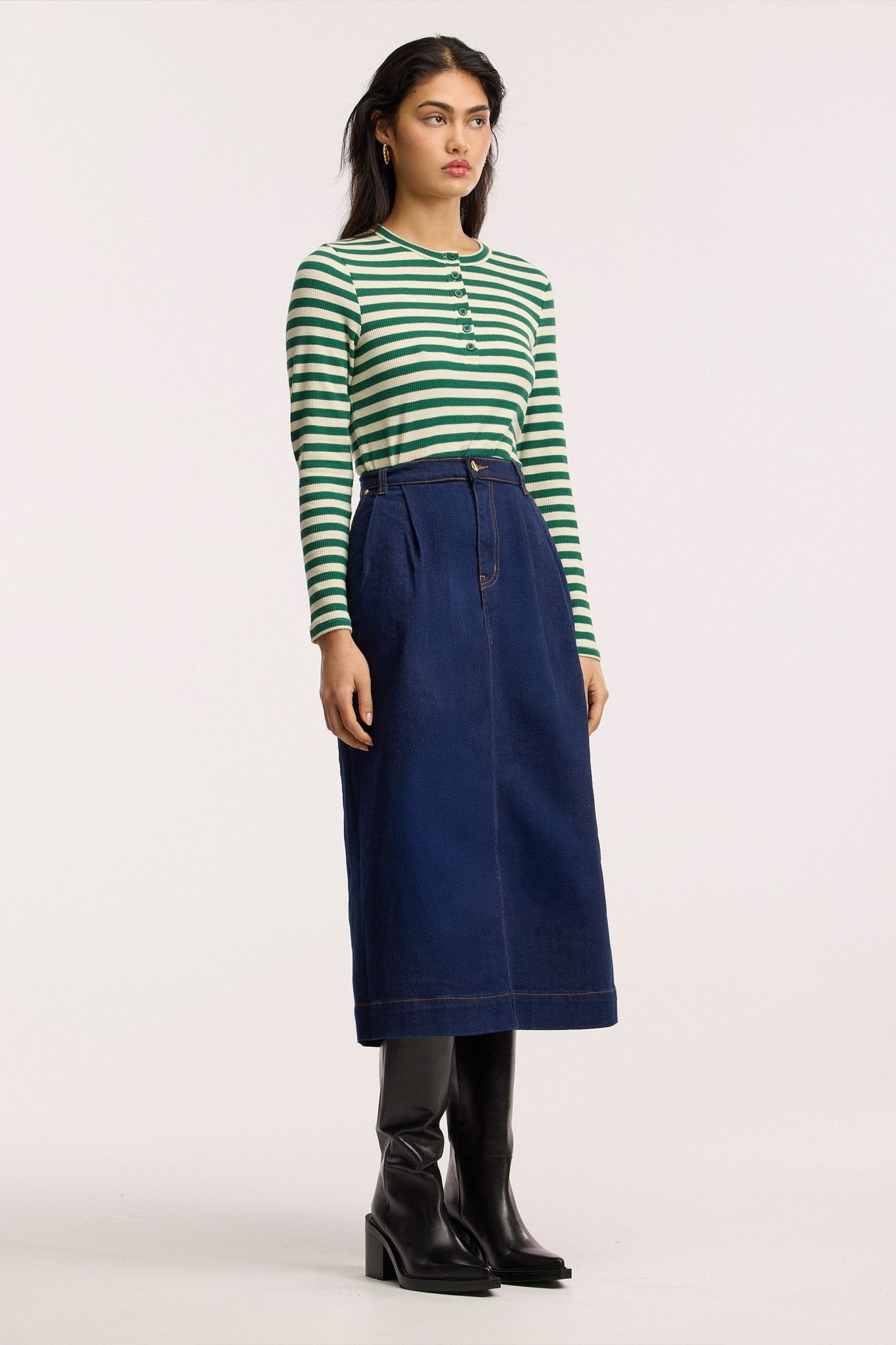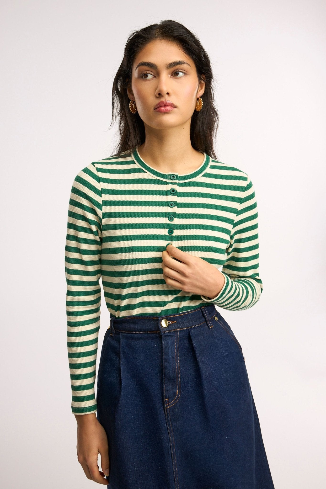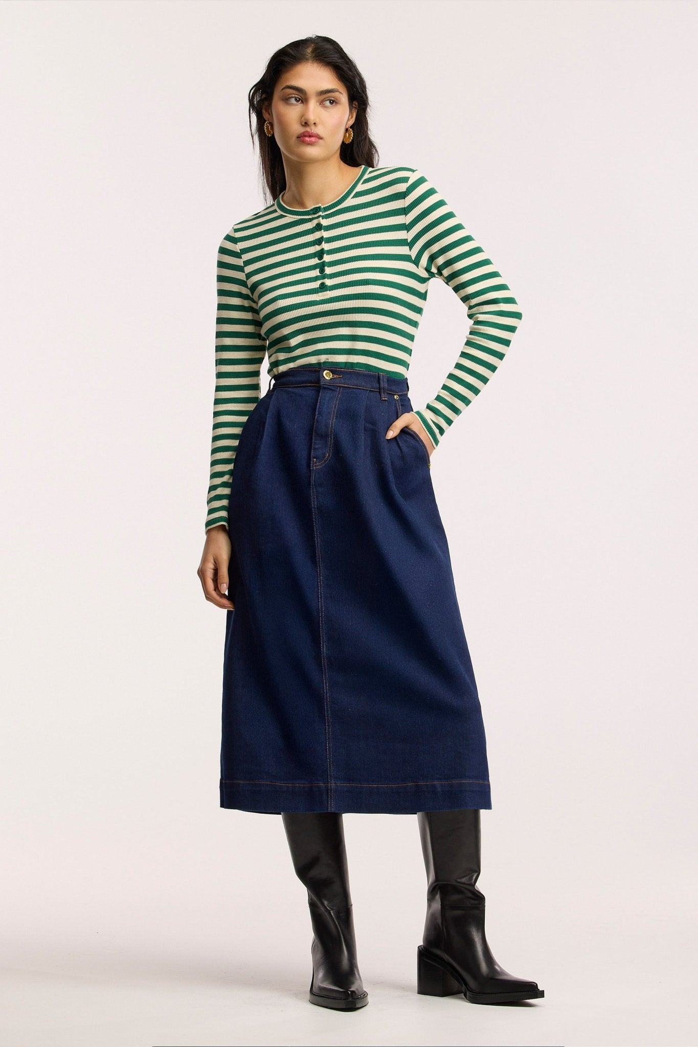 The Verdigris Stripe brings together cool green and soft cream tones, creating a fresh palette perfect for everyday styling. Perfect for the OBUS Lover seeking a staple with a little edge and a lot of comfort.  Pairs well with the Companion Midi Skirt.